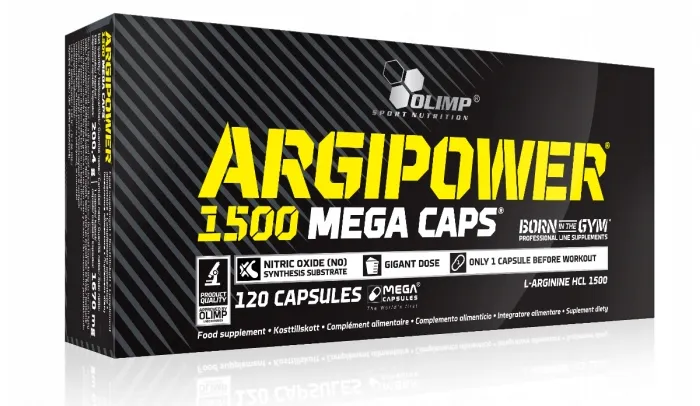 ArgiPower Mega Caps 120 kapsułek firmy Olimp to zaawansowany suplement diety zawierający L-argininę w formie HCL. Ten aminokwas jest kluczowy dla produkcji tlenku azotu, co rozszerza naczynia krwionośne, poprawiając przepływ krwi. Przeznaczony dla aktywnych osób dorosłych, wspiera wydolność fizyczną i rozwój masy mięśniowej. Każda kapsułka zawiera potężne 1500 mg l-argininy HCL, w tym 1230 mg czystej l-argininy. ArgiPower Mega Caps to skuteczny suplement dla osób, które pragną osiągnąć lepsze rezultaty treningowe.