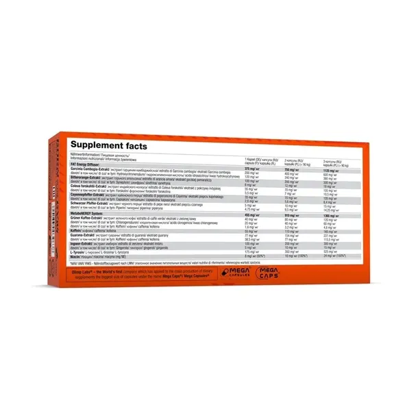 Uwaga: Olimp Thermo Speed Hardcore® Mega Caps® zawiera kofeinę; nie zaleca się stosowania u dzieci i kobiet w ciąży (zawartość kofeiny: 285 mg/ 3 kapsułki). Nie zaleca się stosowania u kobiet karmiących piersią, u osób z chorobami serca, nadciśnieniem lub w przypadku nadwrażliwości na którykolwiek ze składników preparatu. Nie przekraczać spożycia 400 mg kofeiny dziennie ze wszystkich źródeł.