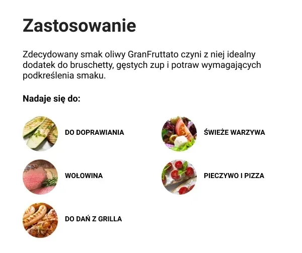 Ta premiumowa oliwa idealnie komponuje się zarówno z prostymi, jak i wyrafinowanymi potrawami. Jej intensywny charakter sprawia, że doskonale nadaje się do marynat, sałatek, grillowanych warzyw czy jako wykwintne dopełnienie świeżego chleba. Każde użycie to gwarancja autentycznego włoskiego smaku.