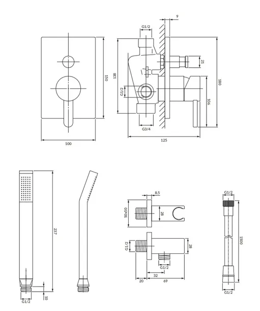 - bateria prysznicowa, deszczownica, słuchawka prysznicowa, uchwyt prysznicowy, wąż prysznicowy