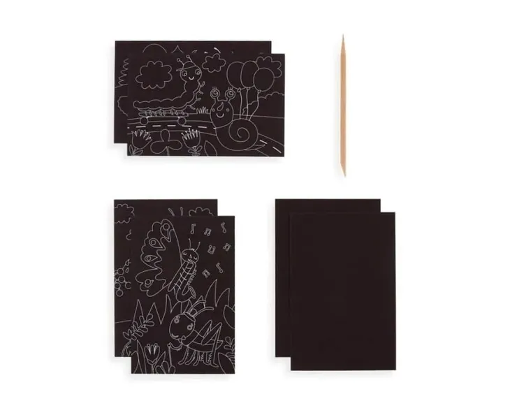 Ciekawy zestaw kartek do zabawy plastycznej i ćwiczenia sprawności manualnej. Zabawa polega na zdrapaniu wierzchniej czarnej warstwy tak aby powstał obrazek.Dodatkowo zestaw zawiera kartki z liniami dzięki czemu dziecko z łatwością odwzoruje obrazek z owadami.