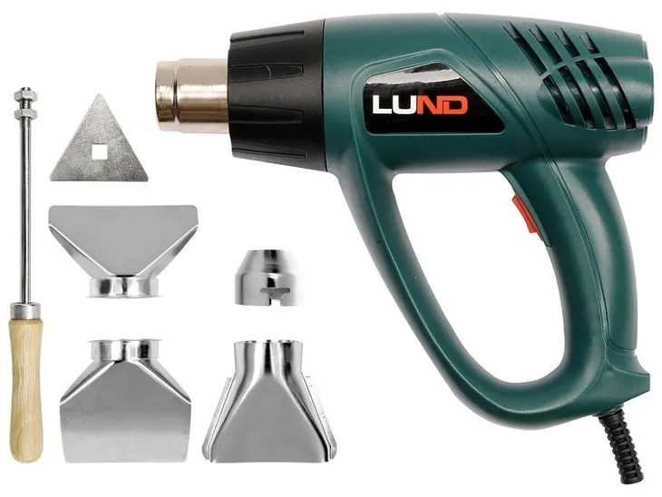 Opalarka marki LUND z wyposażeniem do usuwania powłok malarskich i lakierniczych, formowania i obkurczania przy pomocy gorącego powietrza. Nadaje się również do lutowania i zgrzewania. Narzędzie posiada dwa stopnie natężenia pracy. Ergonomiczna, miękka rączka oraz małe wymiary znacznie ułatwiają pracę.