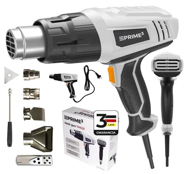 Opalarka elektryczna Prime3 THG21 to uniwersalne narzędzie. Dzięki wysokiej temperaturze skutecznie zmiękcza stare powłoki lakiernicze i farby, ułatwiając ich usunięcie z powierzchni. Może być używana do lutowania metali oraz do rozmrażania zamarzniętych rur czy innych elementów. Świetnie sprawdzi się zarówno podczas prac warsztatowych, jak i przy drobnych remontach w domu. Przyspiesza schnięcie farb, lakierów, klejów czy zapraw. Umożliwia zgrzewanie materiałów termokurczliwych, folii budowlanych czy taśm, formowanie lub obkurczanie plastików, np. przy naprawie zderzaków samochodowych lub montażu rur termokurczliwych. Ciepłe powietrze z opalarki rozpuszcza klej, co ułatwia usunięcie naklejek, etykiet czy tapet bez uszkodzenia powierzchni. Opalarka może być również używana do ekologicznego usuwania chwastów bez użycia środków chemicznych. W zestawie wraz z Prime3 THG21 znajdziemy obszerne akcesorium: skrobak z uchwytem i trzema końcówkami, cztery wymienne dysze oraz szpachelkę.