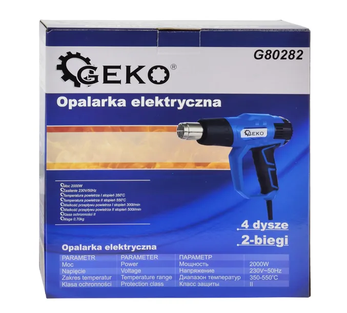Wysokiej jakości opalarka elektryczna renomowanej marki GEKO wyposażona w silnik elektryczny o mocy 2000W umożliwiający wytworzenie temperatury na poziomie 550ºC. Urządzenie wyposażone zostało w 3 poziomowy przełącznik pozwalający wybrać jeden z 2 poziomów temperatury i przepływu wydmuchiwanego powietrza. Opalarka doskonale sprawdzi się podczas usuwania starej farby, różnego rodzaju olein, idealna do pracy z materiałami termokurczliwymi. Może być używana do rozpalania pieca bądź grilla bez konieczności stosowania rozpałki.