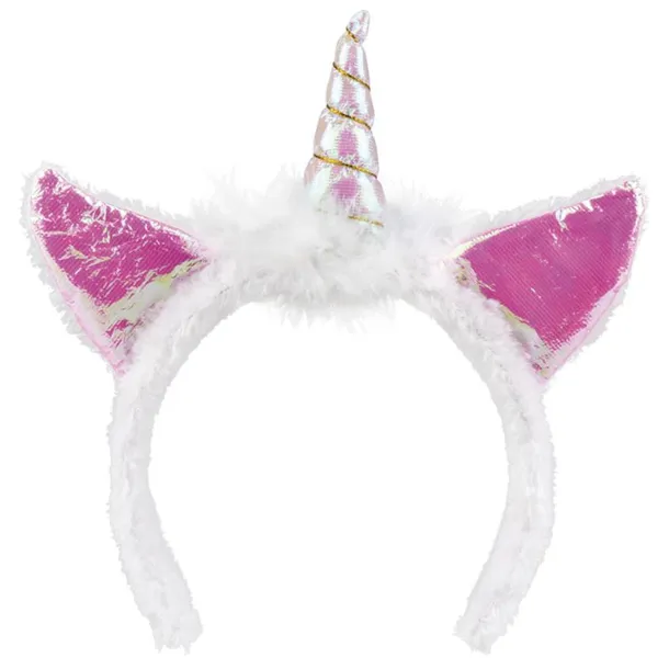 Opaska jednorożec z uszami i rogiem obszytym białym futerkiem.