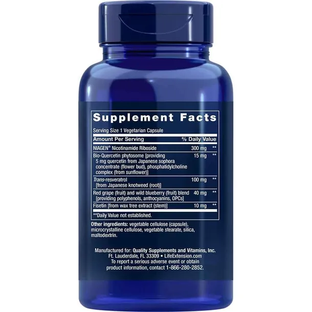 Chlorek rybozydu nikotynamidu, kapsułka (hydroksypropylometyloceluloza), resweratrol z ekstraktu z korzenia rdestowca japońskiego (Fallopia japonica (Houtt.), galaktomannany z ekstraktu z nasion kozieradki pospolitej (Trigonella foenum-graecum L.), kwercetyna z koncentratu pączków kwiatowych sophora japońskiego (Sophora japonica L.), lecytyny słonecznikowe, substancja wypełniająca (celuloza mikrokrystaliczna/żel celulozowy), substancje przeciwzbrylające (kwasy tłuszczowe, dwutlenek krzemu), fisetyna z ekstraktu z drzewa woskowego (Toxicodendron succedaneum)