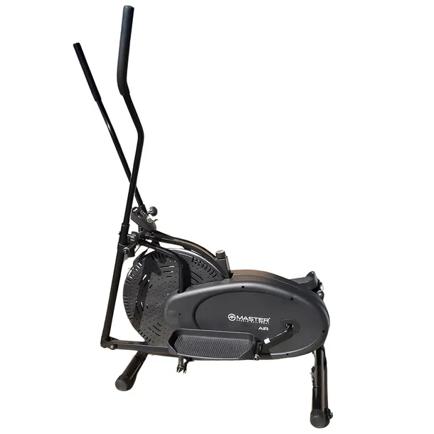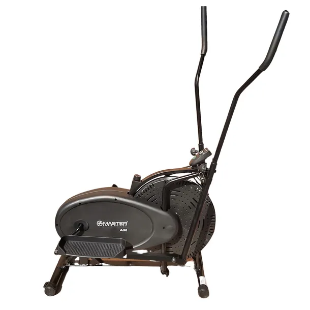 Orbitrek treningowy MASTER AIR posiada 5 kg koło zamachowe z ręczną regulacją obciążenia. Urządzenie ma bardzo stabilną konstrukcję. Jest orbitrekiem z potrzebnymi funkcjami do intensywnego treningu w domu. Dzięki naturalnemu ruchowi i gładkiej pracy nadaje się on do treningu wszystkich partii mięśni. Komputer z wyświetlaczem LCD posiada wiele przydatnych funkcji. Wyświetlacz pokazuje wszystkie informacje takie jak, czas, prędkość, dystans i spalone kalorie.