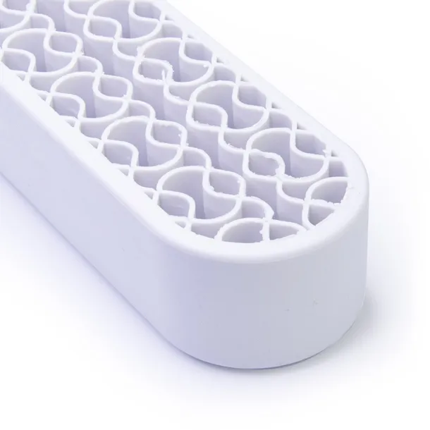Nowoczesny i profesjonalny stojak na pędzelki do żelu, akrylu również na pędzle do makijażu idealnie sprawdzi się jako stojak do przechowywania jak i suszenia każdego rodzaju pędzli kosmetycznych i innych przyborów kosmetycznych. Po ułożeniu pędzli włosiem ku górze stojak pełni funkcję oryginalnej i stylowej ozdoby w łazience czy salonie kosmetycznym ułatwiając przechowywanie i używanie pędzli. Twoje pędzle będą zawsze pod ręką, widoczne i nie będą się gubić. Stojak posiada otwory o różnych rozmiarach dzięki czemu pomieści zarówno duże, średnie jak i małe pędzle. Wykonany jest z tworzywa sztucznego o gładkiej błyszczącej powierzchni dzięki dzięki czemu świetnie się prezentuje.