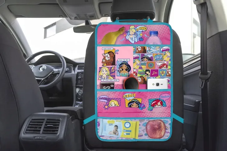 Uniwersalny organizer ozdobiony motywami z popularnych bajek Disney'a, pasuje do większości foteli samochodowych. Jest łatwy w montażu z możliwością regulacji długości pasków mocujących.