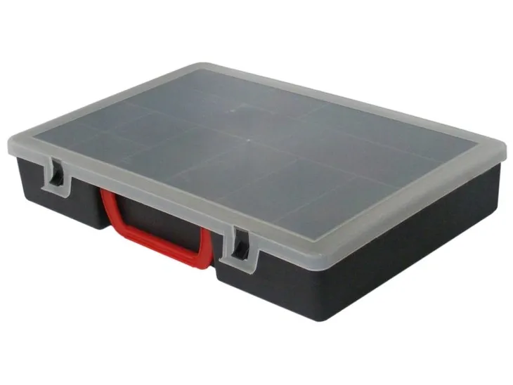 - przegrody organizacyjne, przeźroczysta pokrywa, uchwyt do przenoszenia, zatrzaski zabezpieczające