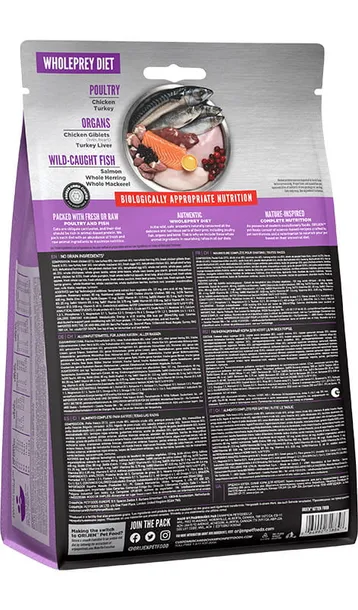 Skład: świeże mięso kurczaka (31%), surowe mięso indyka (8%), surowy łosoś (6%), surowy cały śledź (5%), świeże organy kurczaka (wątroba, serce) (4,5%), surowa wątroba indyka (4%), surowa cała makrela (4%), świeże jaja (4%), dehydratyzowany kurczak (4%), dehydratyzowany indyk (4%), dehydratyzowany śledź (4%), dehydratyzowana wątroba kurczaka (4%), dehydratyzowane jaja (4%), cała czerwona soczewica, cały groch, olej z rdzawca (3%), cała ciecierzyca, cała zielona soczewica, cała fasola pinto, cała fasola biała, skrobia grochowa, zmielona trawa miskant, tłuszcz z kurczaka (0,5%), świeża cała dynia, świeża cała dynia piżmowa, suszony kelp, suszony korzeń cykorii, świeże całe jabłka, świeża cała marchew, świeże całe gruszki, świeża cała cukinia, świeże liście buraków, świeży jarmuż, świeży szpinak, świeże liście rzepy, całe borówki, cała żurawina, całe jagody saskatoon, korzeń łopianu, lawenda, korzeń prawoślazu lekarskiego, ostropest plamisty, owoce dzikiej róży, kurkuma. DODATKI (na kg): dodatki technologiczne: ekstrakt tokoferolu z olejów roślinnych: 121 mg, kwas cytrynowy: 40 mg. Dodatki sensoryczne: ekstrakt z rozmarynu: 80 mg. Dodatki żywieniowe: 3a890a chlorek choliny (cholina): 500 mg, 3a370 tauryna: 400 mg, 3b606 (cynk): 80 mg, 3b406 (miedź): 11 mg, 3a821 witamina B1: 12,5 mg, 3a825i witamina B2: 5 mg, 3a314 witamina B3: 25 mg, 3a841 witamina B5: 4 mg, 3a831 witamina B6: 3,75 mg, 3a880 witamina B7: 0,03 mg, 3a316 witamina B9: 0,4 mg, witamina B12: 0,05 mg, witamina E: 60 IU. Dodatki zootechniczne: 4b1707 Enterococcus faecium NCIMB 10415 1x10^9 CFU.