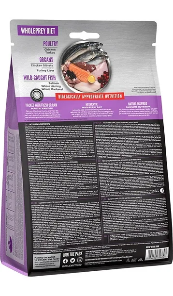 Skład: świeże mięso kurczaka (31%), surowe mięso indyka (8%), surowy łosoś (6%), surowy cały śledź (5%), świeże organy kurczaka (wątroba, serce) (4,5%), surowa wątroba indyka (4%), surowa cała makrela (4%), świeże jaja (4%), dehydratyzowany kurczak (4%), dehydratyzowany indyk (4%), dehydratyzowany śledź (4%), dehydratyzowana wątroba kurczaka (4%), dehydratyzowane jaja (4%), cała czerwona soczewica, cały groch, olej z rdzawca (3%), cała ciecierzyca, cała zielona soczewica, cała fasola pinto, cała fasola biała, skrobia grochowa, zmielona trawa miskant, tłuszcz z kurczaka (0,5%), świeża cała dynia, świeża cała dynia piżmowa, suszony kelp, suszony korzeń cykorii, świeże całe jabłka, świeża cała marchew, świeże całe gruszki, świeża cała cukinia, świeże liście buraków, świeży jarmuż, świeży szpinak, świeże liście rzepy, całe borówki, cała żurawina, całe jagody saskatoon, korzeń łopianu, lawenda, korzeń prawoślazu lekarskiego, ostropest plamisty, owoce dzikiej róży, kurkuma. DODATKI (na kg): dodatki technologiczne: ekstrakt tokoferolu z olejów roślinnych: 121 mg, kwas cytrynowy: 40 mg. Dodatki sensoryczne: ekstrakt z rozmarynu: 80 mg. Dodatki zootechniczne: 4b1707 Enterococcus faecium NCIMB 10415 1x10^9 CFU.