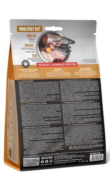 Skład: świeże mięso kurczaka (20%), surowe mięso indyka (10%), surowy cały śledź (9%), świeże organy kurczaka (wątroba, serce) (6%), surowy cały morszczuk północnopacyficzny (5%), surowa wątroba indyka (5%), świeże jaja (5%), dehydratyzowany kurczak (4%), dehydratyzowany indyk (4%), dehydratyzowana makrela (4%), dehydratyzowana sardynka (4%), dehydratyzowany śledź (4%), tłuszcz z kurczaka (4%), cała czerwona soczewica, cały groch, cała zielona soczewica, cała ciecierzyca, włókno soczewicy, cała fasola pinto, skrobia grochowa, cała fasola biała, olej z rdzawca (1%), suszony kelp, świeża cała dynia, świeża cała dynia piżmowa, świeża cała cukinia, świeża cała marchew, świeże całe jabłka, świeże całe gruszki, suszony korzeń cykorii, świeży jarmuż, świeży szpinak, świeże liście buraków, świeże liście rzepy, cała żurawina, całe borówki, całe jagody saskatoon, kurkuma, ostropest plamisty, korzeń łopianu, lawenda, korzeń prawoślazu lekarskiego, owoce dzikiej róży. DODATKI (na kg): dodatki technologiczne: ekstrakt tokoferolu z olejów roślinnych: 121 mg, kwas cytrynowy: 40 mg. Dodatki sensoryczne: ekstrakt z rozmarynu: 80 mg. Dodatki żywieniowe: 3a890 chlorek choliny (cholina): 1190 mg, 3b606 (cynk): 105 mg, 3b406 (miedź): 11 mg, 3a821 witamina B1: 12,5 mg, 3a825i witamina B2: 10 mg, 3a314 witamina B3: 50 mg, 3a841 witamina B5: 8 mg, 3a831 witamina B6: 6,5 mg, 3a316 witamina B9: 0,75 mg, 3a880 witamina B7: 0,13 mg, witamina B12: 0,1 mg, 3a710 witamina K3: 0,5 mg, 3a672a witamina A: 3750 IU, 3a671 witamina D3: 500 IU, 3a700 witamina E: 290 IU, 3a300 witamina C: 12,5 IU. Dodatki zootechniczne: 4b1707 Enterococcus faecium NCIMB 10415 2,2x10^6 CFU.