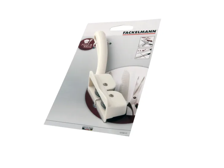 Ostrzałka wykonana z solidnego tworzywa, posiadająca ostrza wykonane ze stali nierdzewnej.