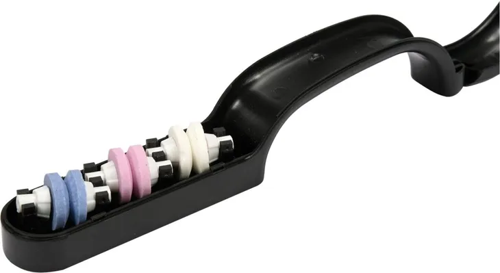 Ta ostrzałka wyposażona jest w trzy podwójne tarcze o zróżnicowanej twardości, co umożliwia efektywne ostrzenie noży oraz innych podobnych narzędzi. Jej korpus, wykonany z wytrzymałego tworzywa, służy jednocześnie jako pojemnik na wodę. Tarcze ścierne działają „na mokro”, co znacząco podnosi skuteczność procesu ostrzenia. W zależności od przeznaczenia, tarcze ostrzałki wykonano z materiału ceramicznego, korundu chromowego i tlenku aluminium. Takie rozwiązanie gwarantuje optymalne rezultaty zarówno przy ostrzeniu wstępnym, jak i precyzyjnym. Precyzyjnie dobrane kąty tarcz, specjalne szczeliny prowadzące ostrze oraz wykorzystanie wody zapewniają skuteczne i dokładne naostrzenie.