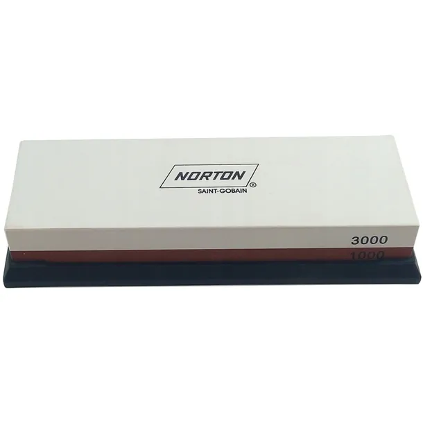 Osełka dwustronna o gradacji P240 / P1000 przeznaczona jest do naprawy i usuwania niedoskonałości. Gradacja P1000 odpowiada za regularne ostrzenie, pozwala ona na wyrównanie i zwiększenie precyzyjności ostrza. Gradacja P3000 odpowiada za uzupełnienie efektów ostrzenia na kamieniu o gradacji 1000 dzięki nim uzyskamy nóż o ostrej, gładkiej i równej klindze. Przed użyciem osełki należy zanurzyć ją w wodzie, aby zapewnić płynne ostrzenie. Nie ma potrzeby kupowania drogich olejków, ponieważ woda smaruje kamienie. Podczas użytkowania osełki wymagają minimalnego nacisku i w ciągu kilku minut zauważalna jest poprawa ostrza. Wszystkie osełki Norton posiadają antypoślizgową podstawę, która zapobiega ich przemieszczaniu się podczas ostrzenia i maksymalizuje bezpieczeństwo użytkownika. Osełki są oznaczone kolorami ziarna, aby wybór był szybki i łatwy. Po zakończeniu ostrzenia należy umyć kamień, aby pozbyć się zgromadzonego na powierzani urobku w wyniku ostrzenia.