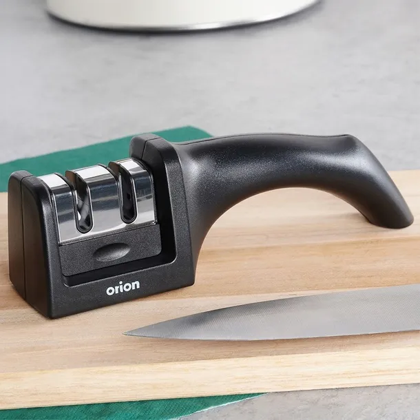 Ostrzałka do noży dwustopniowa. Odpowiednia dla noży bez ząbkowanych i ceramicznych ostrzy. Z jej pomocą możemy naostrzyć każdy nóż w sytuacji, gdy już się stępił. Posiada wygodną rączkę, która zapewni wygodne użytkowanie. Antypoślizgowa podstawa sprawi, że ostrzałka dobrze przylega do blatu. Dzięki ostrzałce ostrość noży jest zachowana nawet do sześciu miesięcy. Oryginalny produkt czeskiej marki Orion. Wyprodukowano zgodnie z europejskimi standardami.