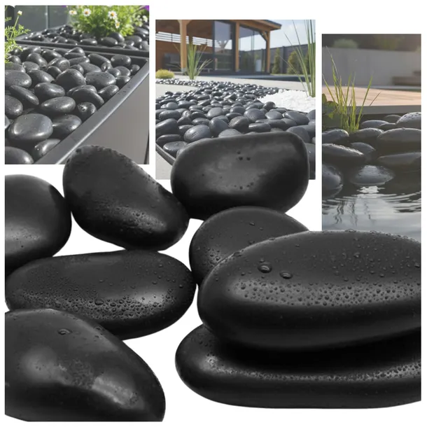 W stanie suchym powierzchnia kamienia może sprawiać wrażenie ciemno grafitowej, lekko matowej, z delikatnym pyłem mineralnym będącym naturalną pozostałością po procesie selekcji. Kontakt z wodą całkowicie zmienia jego odbiór wizualny – wilgoć wydobywa prawdziwe oblicze czarnego otoczaka, pogłębiając barwę do intensywnej czerni i podkreślając naturalny połysk powstały wyłącznie siłami natury.