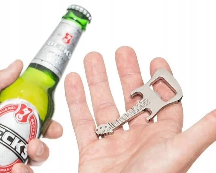 Świetny otwieracz w kształcie gitary dla wszystkich fanów różnych przyjemnych dla ucha dźwięków w tym dźwięku otwierania butelki z ulubionym napojem.