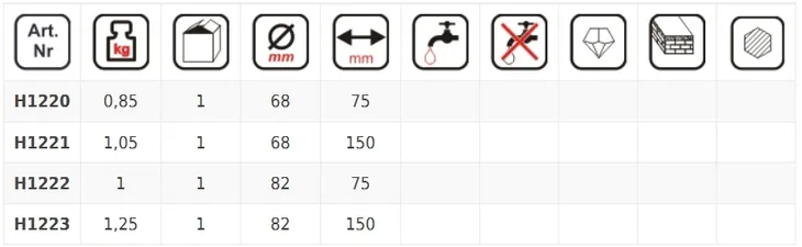 Diamentowa koronka do betonu, gresu, kamienia. Segmenty pokryte są nasypem diamentowym co ułatwia wiercenie otworów w twardych materiałach jak beton, gres, kamień naturalny. Dzięki zastosowaniu wiertła pilotującego proces wiercenia przebiega sprawnie i precyzyjnie. Koronki diamentowe kompatybilne są z uchwytami i wiertłami pilotującymi H1224 (uchwyt SDS PLUS), H1225 (uchwyt sześciokątny HEX), H1226 (uchwyt SDS PLUS). Koronka posiada w zestawie wiertło pilotujące, uchwyt sześciokątny HEX oraz wybijak