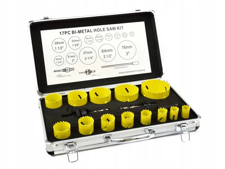 Zestaw składa się z 13 otwornic, przedłużki 300mm, 2 uchwytów do otwornic oraz aluminiowej walizki.