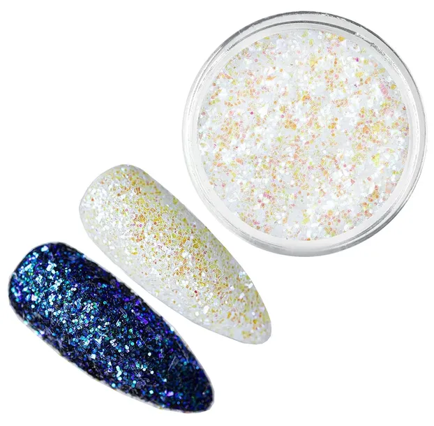 Ozdoba do paznokci Opal Effect Nr 2 Pyłki do paznokci z delikatnymi drobinkami brokatu to świetne urozmaicenie każdego manicure. Jeśli dodamy do tego nieregularne kształty i opalizujące kolory. Recepta na udany manicure gwarantowana! Biel to wyjątkowy kolor o półtransparentnej barwie, która odmieni Twoje dłonie w kilka chwil. Dodaj nuty elegancji i pozostań ekstremalnie modna w tym sezonie! Opalizujący efekt pokruszonego diamentu uzupełniony błyszczącymi drobinkami to Twój niezawodny wybór! Wybierz spośród 4 kolorów i przenieś się do świata pełnego blasku i luminacji! Sposób użycia: Aplikacja jest nadzwyczaj prosta! Nakładamy na mokry, nieutwardzony top lub wtapiamy w żel, lub hybrydę-następnie utwardzamy. Pojemność: masa netto pyłku 1 g, pyłek pakowany w słoiczek 3 ml