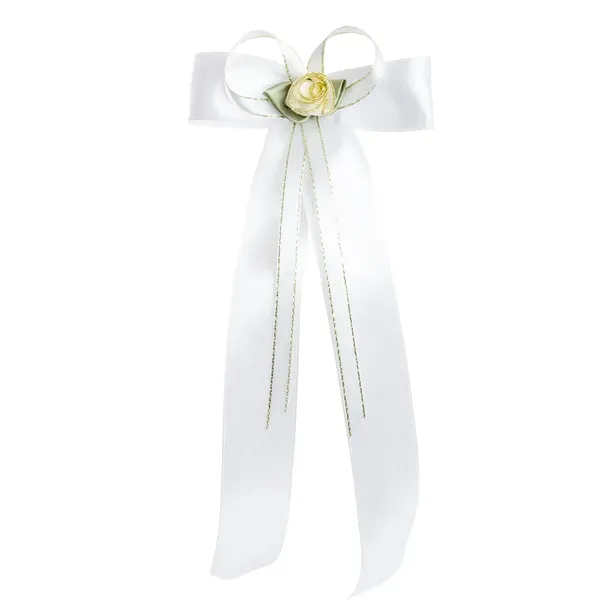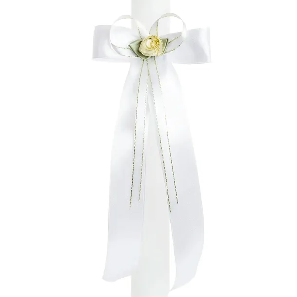 Biała kokardka na świecę. Na jej środku znajduje się dodatkowo mała, wąska, ozdobna tasiemka oraz biały kwiatuszek z zielonymi listkami.Doskonale komponuje się z każdą świecą, dodając jej elegancji.Ozdoba na świecę posiada gumkę, dzięki czemu swobodnie można założyć ją na świecę.Wymiary kokardki: wysokość ok 20 cmszerokość ok 8 cmszerokość gumeczki na płasko: 3,5 cmKokardka powstała w polskiej pracowni.