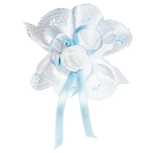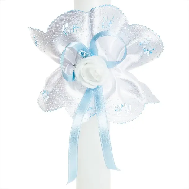 Biała ozdoba na świecę. Na jej środku znajduje się dodatkowo mała, wąska niebieska tasiemka oraz biała różyczka. Na całości dodane są delikatne niebieskie zdobienia.Doskonale komponuje się z każdą świecą, dodając jej elegancji.Ozdoba na świecę posiada gumkę, dzięki czemu swobodnie można założyć ją na świecę.Wymiary ozdoby:wysokość (bez tasiemki)ok 9 cmszerokość gumeczki na płasko: 3,5 cmProfitka powstała w polskiej pracowni.