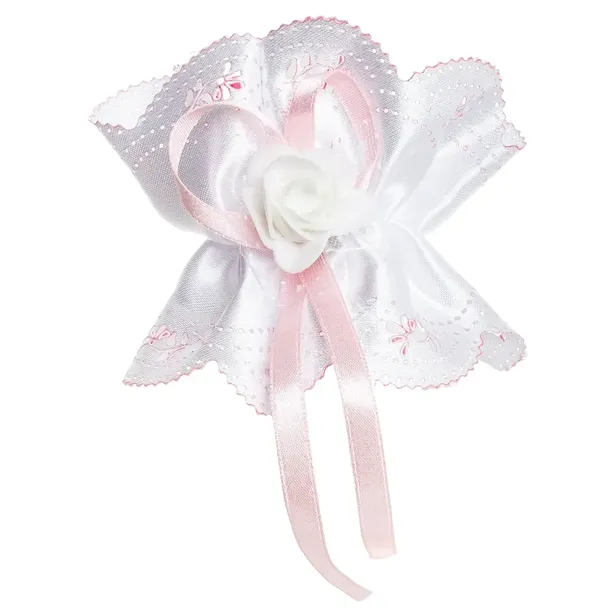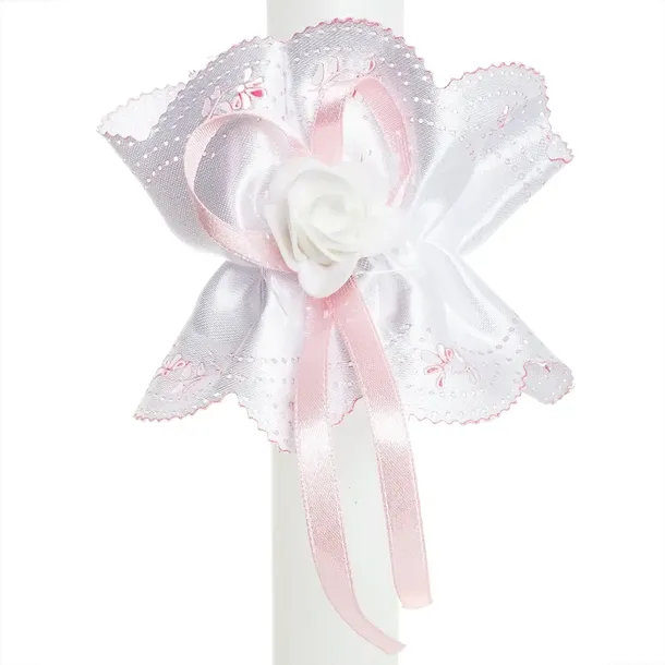 Biała ozdoba na świecę. Na jej środku znajduje się dodatkowo mała, wąska różowa tasiemka oraz biała różyczka. Na całości dodane są delikatne różowe zdobienia.Doskonale komponuje się z każdą świecą, dodając jej elegancji.Ozdoba na świecę posiada gumkę, dzięki czemu swobodnie można założyć ją na świecę.Wymiary ozdoby:wysokość (bez tasiemki)ok 9 cmszerokość gumeczki na płasko: 3,5 cmProfitka powstała w polskiej pracowni.
