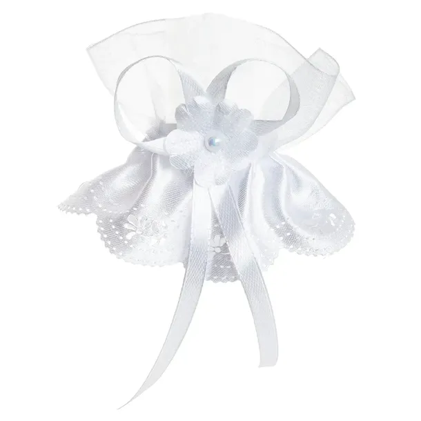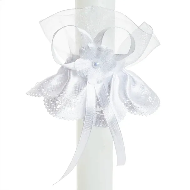 Biała ozdoba na świecę. Na jej środku znajduje się dodatkowo mała, wąska tasiemka oraz biały kwiatuszek z cyrkonią.Doskonale komponuje się z każdą świecą, dodając jej elegancji.Ozdoba na świecę posiada gumkę, dzięki czemu swobodnie można założyć ją na świecę.Wymiary ozdoby:wysokość (bez tasiemki)ok 9 cmszerokość gumeczki na płasko: 3,5 cmProfitka powstała w polskiej pracowni.