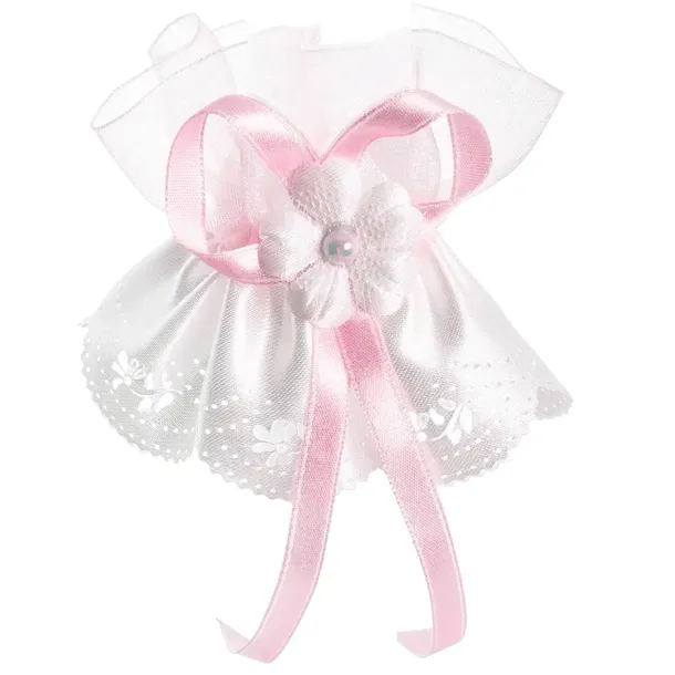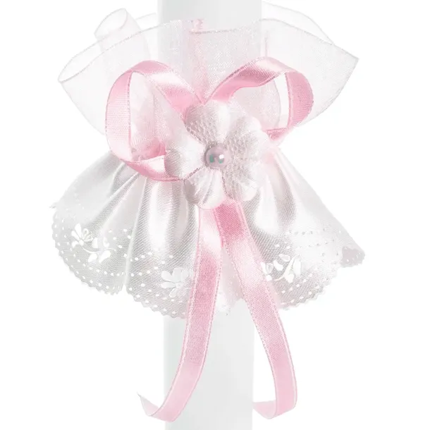 Biała ozdoba na świecę. Na jej środku znajduje się dodatkowo mała, wąska różowa tasiemka oraz biały kwiatuszek z cyrkonią.Doskonale komponuje się z każdą świecą, dodając jej elegancji.Ozdoba na świecę posiada gumkę, dzięki czemu swobodnie można założyć ją na świecę.Wymiary ozdoby:wysokość (bez tasiemki)ok 9 cmszerokość gumeczki na płasko: 3,5 cmProfitka powstała w polskiej pracowni.