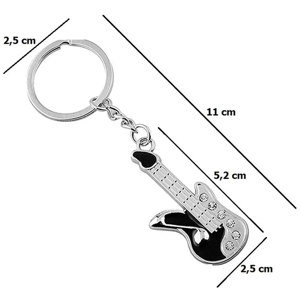 Ozdobny brelok w kształcie gitary z cyrkoniami. Breloczek posiada oczko do przypięcia kluczy, może również służyć jako ozdobna przywieszka do plecaka lub torby. Nada Twoim kluczykom lepszego wyglądu. Idealnie nadaje się również jako upominek dla bliskiej osoby.