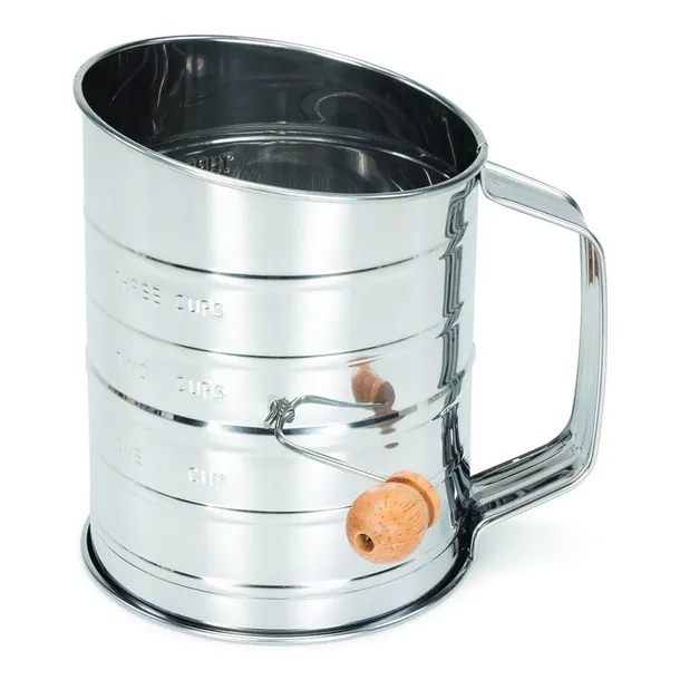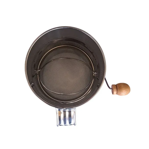 Obrotowy kubek do przesiewania mąki na korbę pojemność 400g stal nierdzewna wysokość 14cm .