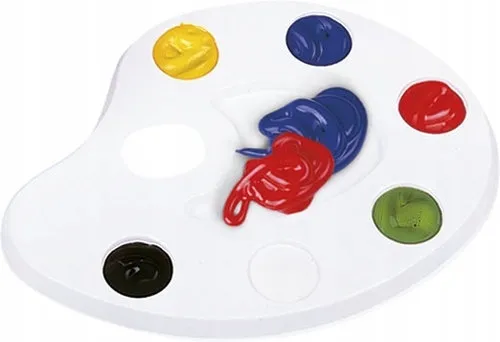 Paletka malarska do mieszania farb wykonana z tworzywa sztucznego. Posiada 6 wgłębień na farby, wygodny uchwyt oraz miejsce do odłożenia pędzelka