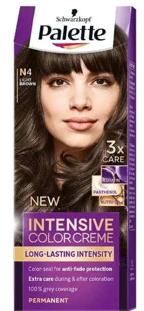 Palette farba N4 jasny brąz Palette Intensive Color Creme Farby Palette z serii Intensive Color Creme to produkty unikatowe, bo oprócz nadawania koloru, pielęgnują one również nasze włosy. Produkty zawierają płynną keratynę, która nabłyszcza i odżywia, jest ratunkiem dla zniszczonych włosów. Do tego farba zawiera formułę chroniącą przed blaknięciem koloru, która gwarantuje intensywność koloru przez długi czas. Krem koloryzujący nadaje wyjątkowo intensywny, lśniący kolor, który teraz trwa dłużej. Za minimalną cenę otrzymujemy maksimum jakości. Seria ma ogromną gamę kolorystyczną i każdy znajdzie coś dla siebie. Do tego farby są wydajne i łatwe w aplikacji.