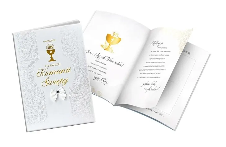 Książeczki PMB Premium to produkt wyjątkowy - pięknie wydany z twardą okładką zdobioną perłową i złotą folią oraz dodatkami takimi jak perły i diamenciki, z kolorowym wnętrzem, pięknymi grafikami i cytatami oraz życzeniami i miejscem na osobistą dedykację. Na wewnętrznej stronie okładki wklejona jest specjalna, nieduża koperta, w której można przekazać kartę podarunkową lub banknot. Książeczka PMB Premium Kukartka to idealny prezent na wyjątkową okazję, jaką niewątpliwie jest Pierwsza Komunia Święta. Cechy szczególne: wymiary książeczki: 15,1 x 20,8 cm. zdobienie: złota oraz perłowa folia lub welur oraz dodatki takie jak perły i diamenciki wnętrze: kolorowe, z grafikami, cytaty, miejsce na dedykację i wpisanie miejsca/godziny uroczystości, gratis: koperta na drobny upominek wewnątrz, okazja: komunia, Pierwsza Komunia Święta.