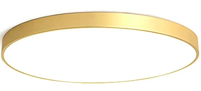 Nowoczesny płaski panel LED w formie złotego dysku z białym mlecznym szkłem akrylowym.