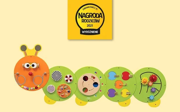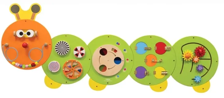 Panel ścienny gąsienica jest złożony z pięciu odrębnych elementów. Każdy element to drewniane koło o średnicy 44 cm i kryje przed Wami inne atrakcje. Oto funkcje poszczególnych paneli :