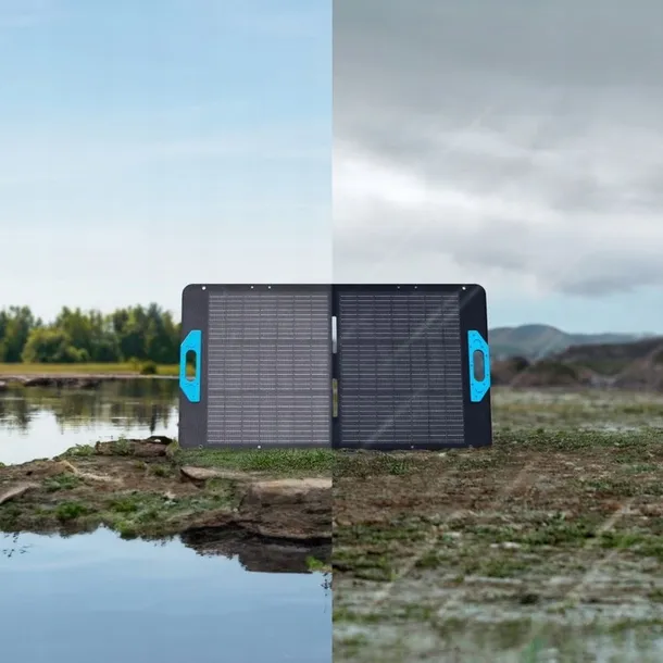 Lekka i kompaktowa konstrukcja z wbudowanym uchwytem ułatwia transport i składanie panelu. Po złożeniu ma zwarte wymiary 55,6 x 60,7 x 3,3 cm i waży zaledwie 4,4 kg. Dzięki złączu MC4 i dołączonym adapterom XT-60 oraz DC7909, panel jest kompatybilny z szeroką gamą stacji zasilających i systemów off-gridowych o napięciu wejściowym 11-60V.