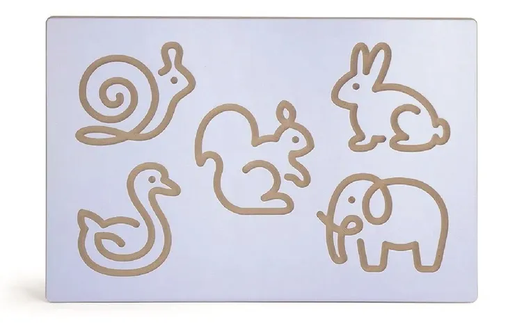 Oferowany panel wymienny to nauka rysowania. Po włożeniu specjalnego drewnianego "ołówka" (dwa ołówki dostępne na wyposażeniu ramy) w przygotowany otwór dziecko niezawodnie wykona danego zwierzaka. Na panelu mamy pięć sporych zwierząt do nauki rysowania: ślimaczka, królika, wiewiórkę, kaczkę i słonika (wymiary zwierzaków ok. 15 x 16cm). Co równie istotne w ćwiczeniu kształty zwierząt zostały wykonane tak, aby dziecko rysując je nie odrywało ręki.