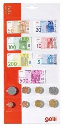 W zestawie 84 sztuki papierowych banknotów i 32 plastikowe monety pieniądze w nominałach: 5, 10, 20, 50, 100, 200, 500 euro nieco mniejsze od oryginalnych banknotów.