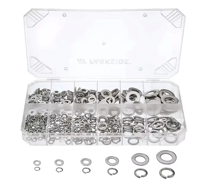 Podkładki sprężynujące: 100 x M4, 60 x M5, 50 x M6, 30 x M8, 15 x M10, 12 x M12