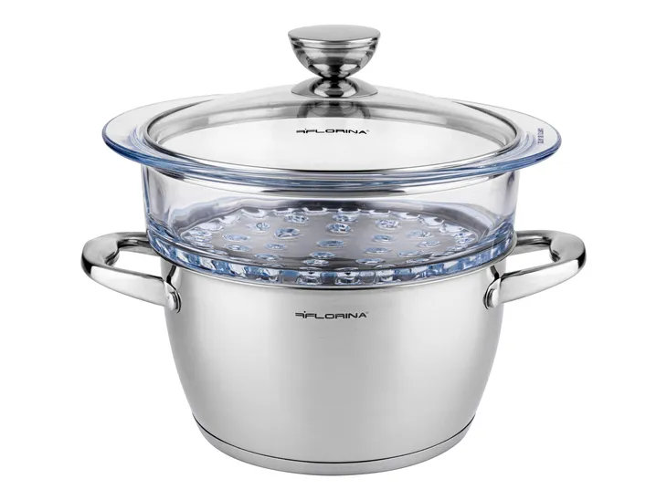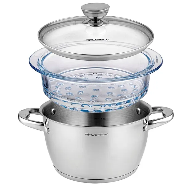 W skład garnka wchodzą 3 elementy: wykonany z wysokiej jakości stali nierdzewnej rondel, szklany parnik oraz szklana pokrywa z odpowietrznikiem.