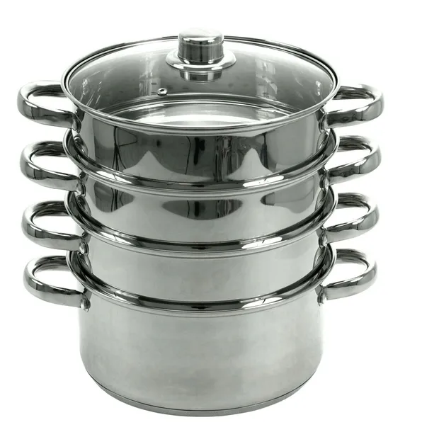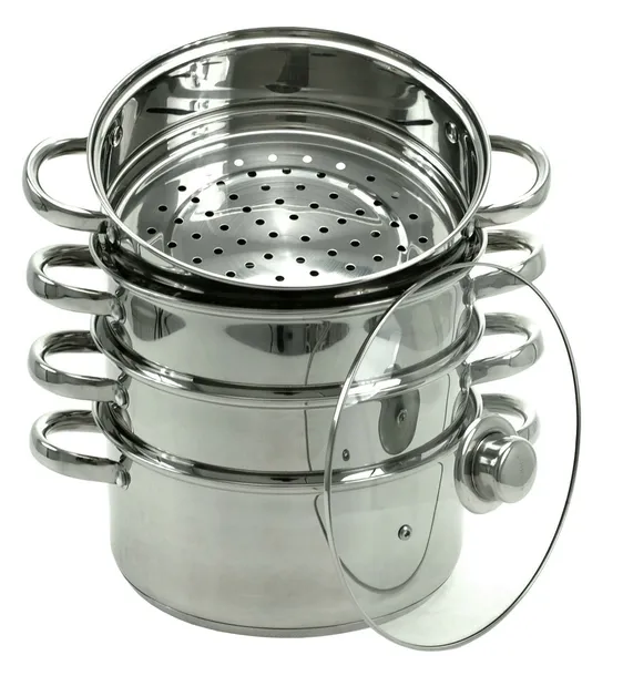 ZESTAW DO GOTOWANIA NA PARZE o łącznej objętości ok. 11L składający się z 5 ELEMENTÓW (GARNEK 3.1L + 3 PAROWNIKI 2.5L + POKRYWKA), wykonany ze stali nierdzewnej 18/8. Uchwyty mocowane za pomocą nitów.