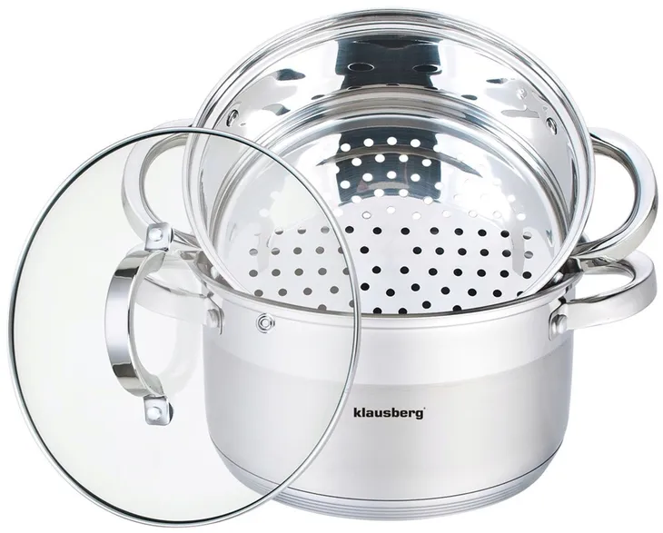 3 częściowy komplet garnków do gotowania na parze KLAUSBERG bazujący na garnku 3.1L / Ø20cm. Zestaw wykonany z wysokiej jakości stali nierdzewnej. Wykorzystana stal składa się z najlepszej jakości stopu powszechnie stosowanego w światowej klasy produktach, co gwarantuje jej wysoką odporność na korozję oraz bardzo dobrą wytrzymałość. Zastosowany materiał umożliwia szybkie podgrzanie potraw i przez dłuższy czas utrzymuje ciepło.