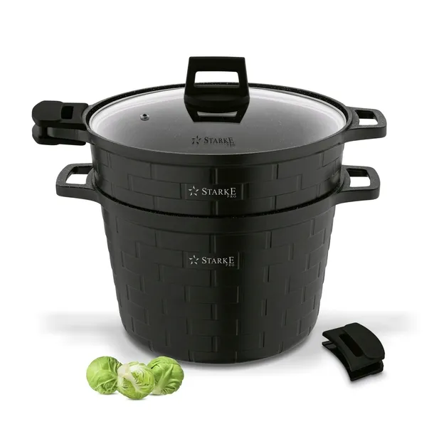 Garnek do gotowania na parze z pokrywką Starke Pro Brick 6,3 l wykonany jest z aluminium. Do jego stworzenia oraz dopasowanego sitka na składniki wykorzystano technikę jednorodnego odlewu aluminiowego die cast. Dzięki temu jest świetnie wyważony i bardzo wytrzymały pod względem mechanicznym oraz termicznym. Wnętrze garnka wykończono powłoką non-stick MARBLE PLUS. Jej wysoka jakość, doskonała przyczepność oraz 3-warstwowa struktura zostały utwardzone. Ma też oznaczenie PFOA Free. Energooszczędność zapewnia dno indukcyjne. To dzięki niemu możesz używać garnka do gotowania na parze Brick na każdej kuchence. W takim garnku z wyjmowanym sitkiem przygotujesz dla bliskich lekkostrawne i zdrowe posiłki. Użyjesz go do różnych składników, w tym mięs, pyz oraz warzyw. Powłoka nieprzywierająca umożliwi ci dodatkowo smażenie na niewielkiej ilości tłuszczu oraz bezproblemową pielęgnację. Zniesie przy tym aż 10 000 cykli ścierania, czyli pięciokrotnie więcej niż zwykłe naczynia non-stick dostępne na rynku. Pokrywka z nierdzewnym rantem i dyskretnym systemem regulowania ilości pary wewnątrz naczynia pozwala na duszenie składników. Ma ona rączkę soft touch, która się nie nagrzewa i nie wyślizgują z dłoni. Uchwyty garnka i wkładu z otworami są odlewane. W komplecie masz 2 nakładki silikonowe, które zapewnią ci bezpieczeństwo i będą ochroną przed rozgrzanym metalem. Jednym słowem zyskasz solidny i energooszczędny garnek do gotowania na parze, który po wyjęciu wkładu z sitkiem może być klasycznym garnkiem do zupy. Seria Starke Pro Brick z powłoką typu stone była testowana także przez zawodowego szefa kuchni, Piotra Kucharskiego. Poleca on ten garnek indukcyjny do wieloletniego użytku w domowej kuchni.