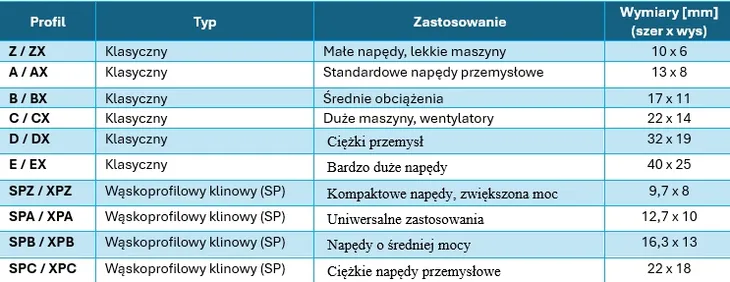 Pasy klinowe wąskoprofilowe to elementy przekładni pasowych, służące do efektywnego przenoszenia mocy i momentu obrotowego przy współpracy z kołem klinowym. Działają na zasadzie tarcia między pasem a rowkiem koła. Charakteryzują się przekrojem trapezowym. Dzięki swojej konstrukcji, w porównaniu do klasycznych pasów klinowych, mogą przenieść znacznie większą moc w mniejszej przestrzeni. Najpopularniejsze profile pasów klinowych wąskoprofilowych to: SPZ (9,7 x 8mm), SPA (12,7 x 10mm), SPB (16,3x13mm), oraz SPC (22 x 18mm).