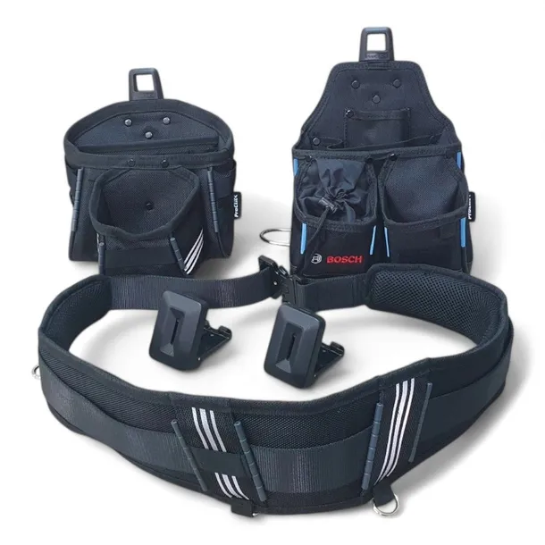 Pas narzędziowy PROCLICK TOOL KIT 93 firmy BOSCH posiada 2 wielofunkcyjne kabury, w których znajduje się aż 8 kieszeni na narzędzia i akcesoria, 41 szlufek na śrubokręty i klucze, 1 metalowy uchwyt na młotek oraz 1 karabińczyk na klucze.