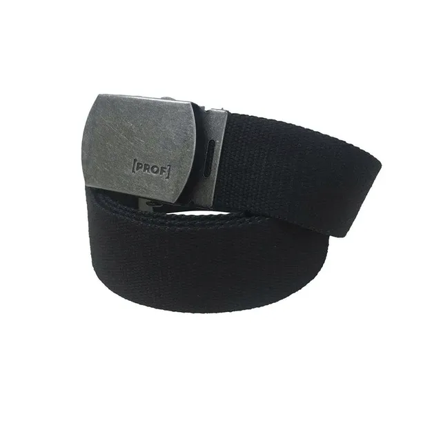 Czarny pasek z materiału z bezstopniową regulacją długości. Długość paska wynosi 130 cm, a chromowany klips ma logo PROF.