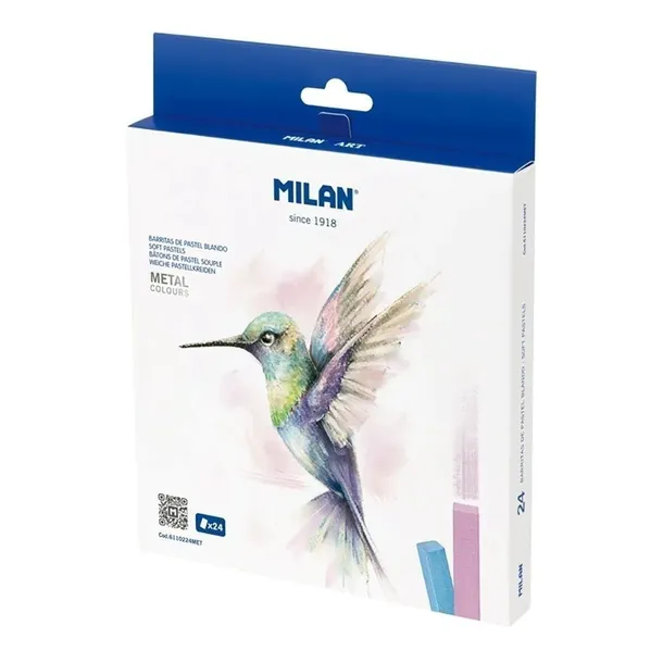 Pastele suche miekkie, w 24 metalicznych kolorach, w kartonowym opakowaniu, MILAN ART. Idealnie nadają się do łatwego i gładkiego malowania, oraz rozcierania, nawarstwiania i pokrywania dużych powierzchni rysunku. Intensywne i jasne kolory. Użyj fiksatywy dla dobrej stabilności i trwałości w pracy. Wysoka odporność na działanie światła. Szczególnie polecane dla artystów. Wymiary pasteli: 65 mm x 10 mm